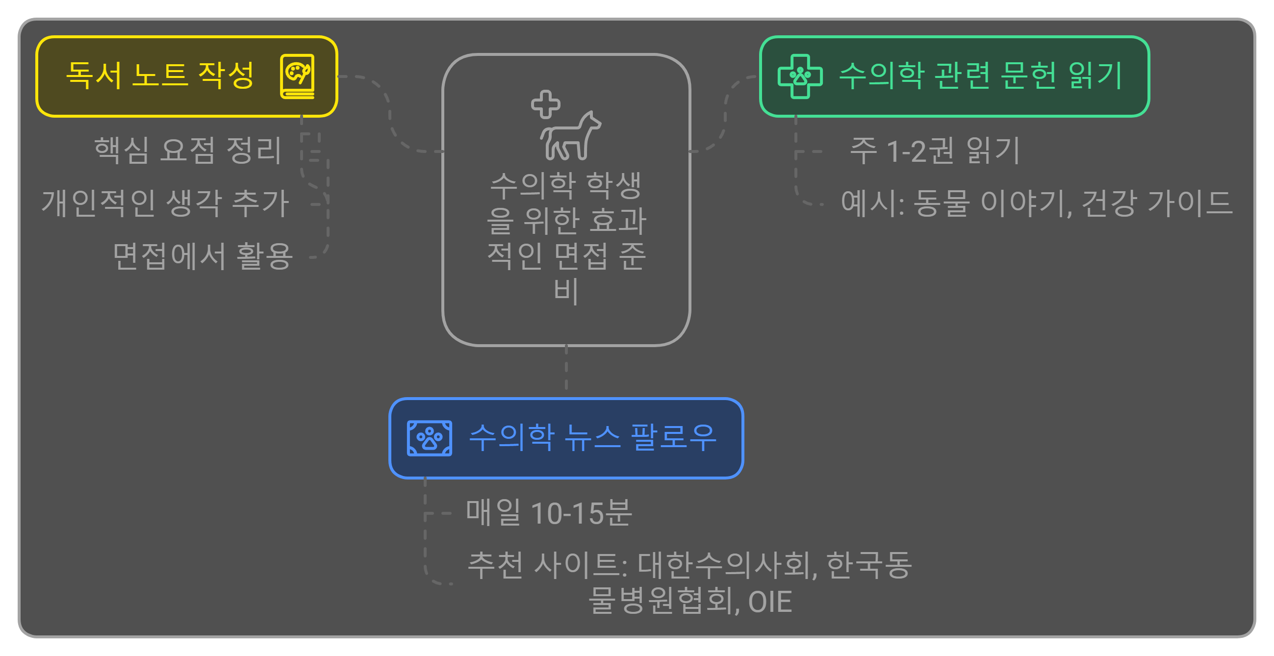 수의사는 동물에 대한 깊은 이해와 지식이 필요합니다. 따라서 꾸준한 독서를 통해 이를 쌓아나가는 것이 중요합니다.